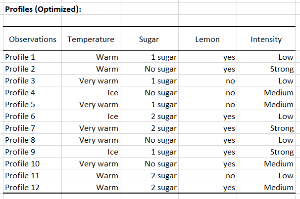 The first step in the conjoint analysis is done in collaboration with experts in the beverage market: choosing the main characteristics that define a drink. The selected factors are : 1. temperature (very hot, hot, iced) 2. sugar (no sugar, 1 sugar, 2 sugar) 3. Lemon (yes, no) 4. intensity (strong, medium, light)