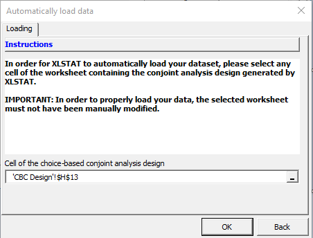 To facilitate data selection and avoid to manually select the three required datasets (Responses, profiles, and choices), you can click on the magic stick. This will automatically load the two datasets if the conjoint design has been generated with XLSTAT and if the sheet of results has not been manually modified (add rows or columns…). A new window will pop up. Select any cell of the sheet containing the design for choice-based conjoint analysis. In this example, we selected cell H13 in the CBC Design sheet. Then click OK.