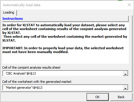In order to facilitate data selection and avoid to manually select the four required datasets (Utilities, Variable information, Simulated market, Product ID), click on the magic stick. This will automatically load the four datasets if the conjoint analysis and the simulated market have been generated with XLSTAT and if the two worksheets have not been manually modified (add rows or columns…). Then select any cell of the sheet containing the results of choice-based conjoint analysis and any cell of the worksheet containing the market generated with XLSTAT. In this example, we selected the cells H13 of the sheets CBC Analysis and Market Generator. Then click OK.