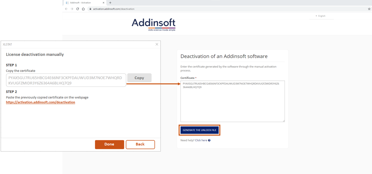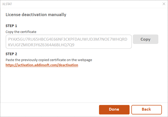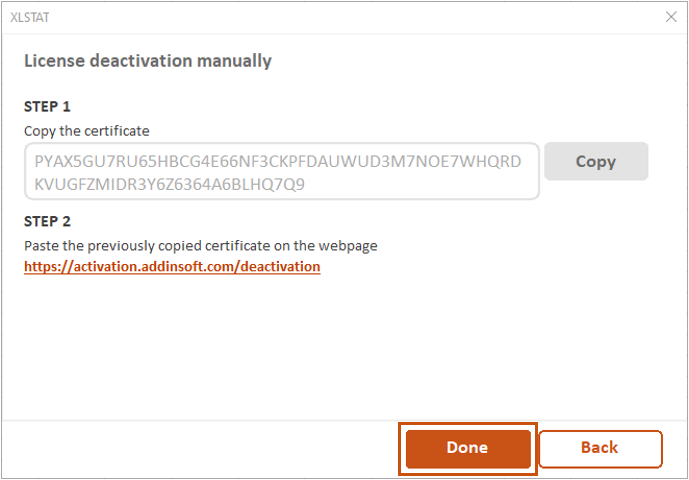 Step 4: On the manual deactivation window in the XLSTAT interface, you can now click on Done. Only do so if you got the previous message, pictured in the Step 3. If you did not, please try copying the code again to the webpage before continuing.
