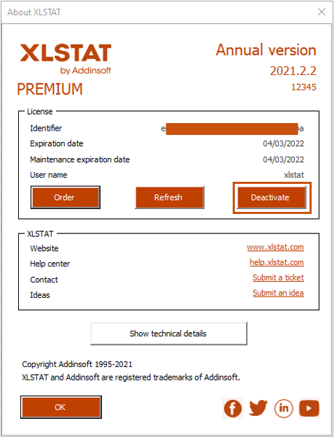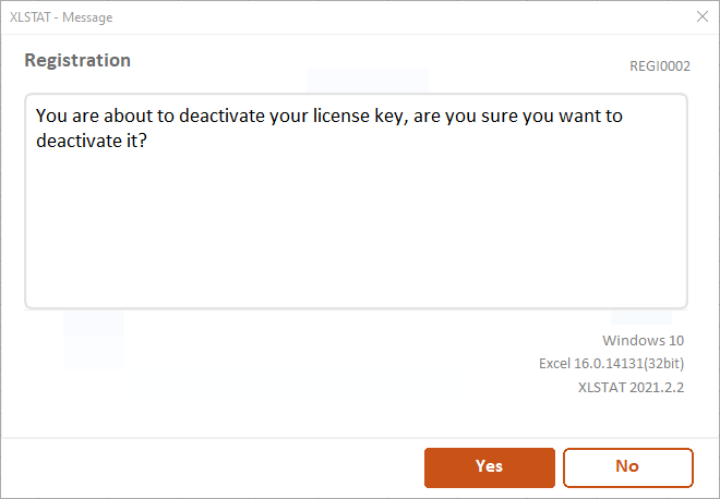 If the process goes well, your license should be deactivated and your XLSTAT version back to Free or Trial, depending on how much time you had left on your evaluation.