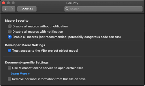 3- Then check Enable all macros (...) and Trust access to the VBA project object model