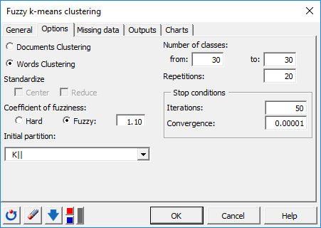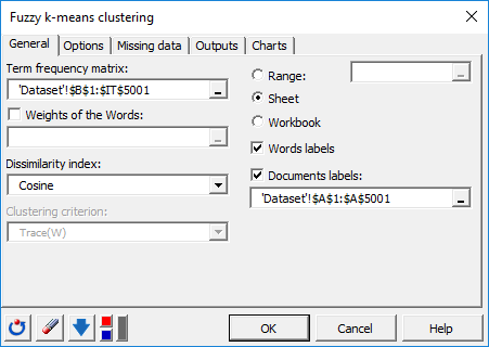 After clicking the button, the dialog box for the Fuzzy k-means clustering appears. You can then select the data via the Term frequency matrix field (cells range selection). The Document labels option is enabled because the first column of data contains the document names. The Word Labels option is also enabled because the first row of data contains term names.