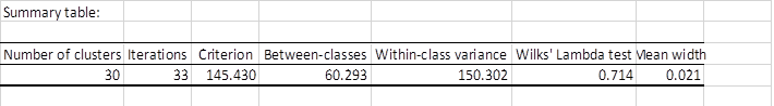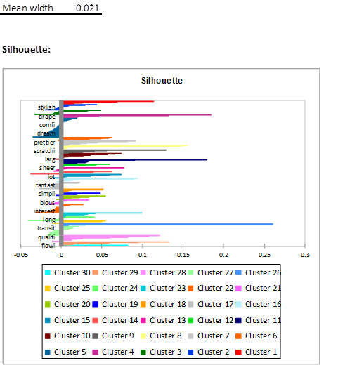 The following figure shows the silhouette plot which indicates the degree of similarity of each observation with respect to its class. The closer these values are to 1, the better the classification. The average of all these values is another overall indicator of quality. The latter highlights a number of observations within each cluster with a high average similarity indicating the presence of strongly correlated terms within each of these groups.