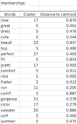 The Memberships table presents for each word, the identifier of the group to which it has been assigned. The latter one is calculated by choosing the group for which the term’s membership probability is maximal (See Membership probabilities table in the report of the demo file). Part of this table is shown below. Cluster 17 contains several positive sentiments.