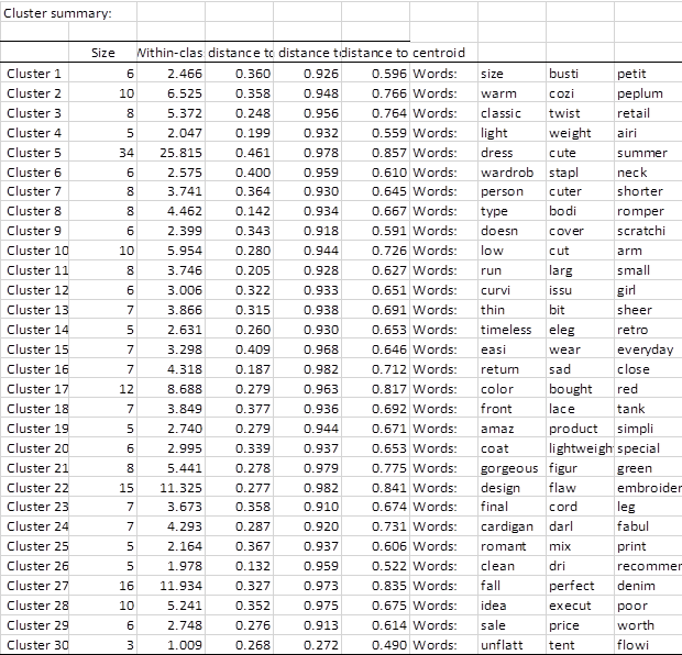 Generated classes are associated with terms that appear frequently in the same documents. For example, Cluster 11 contains the terms "run" "large" and "small" which most certainly links these words to a negative sentiment and then replace them in all the reviews with the "Size issues" thematic.