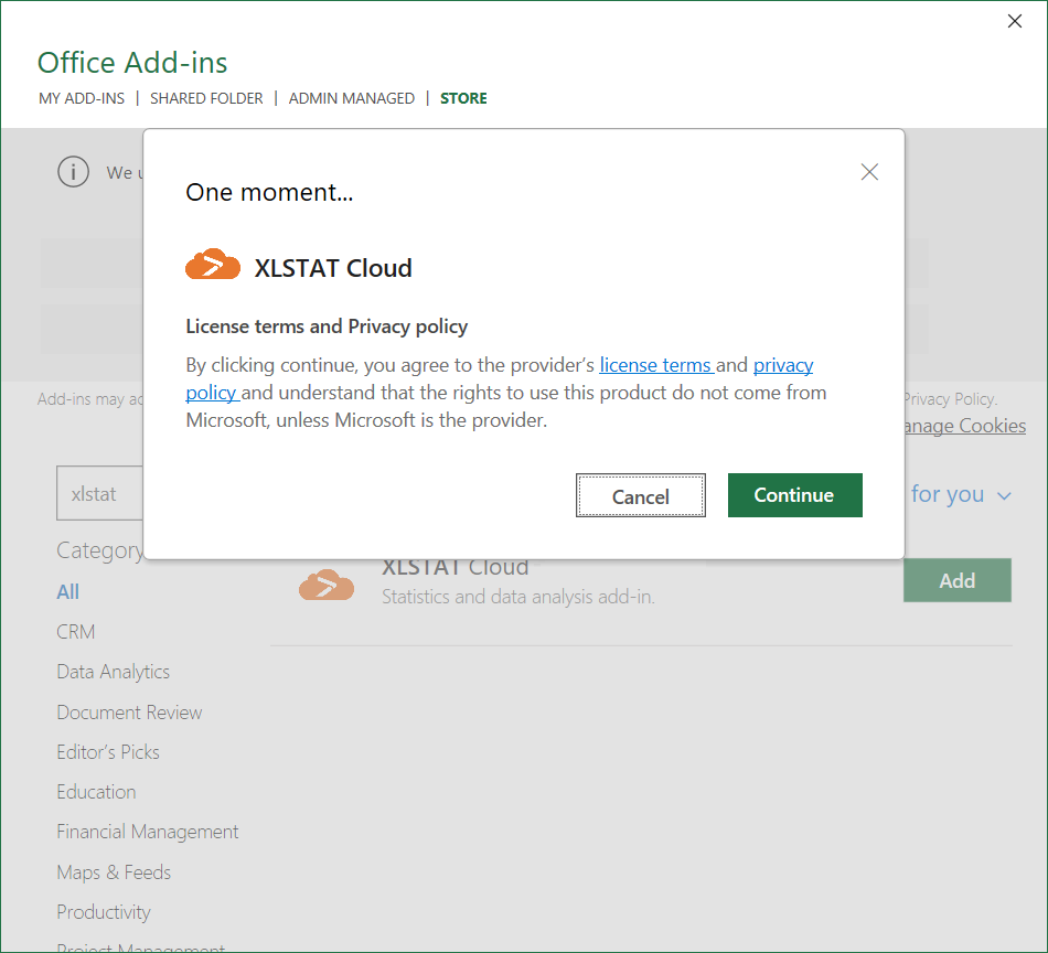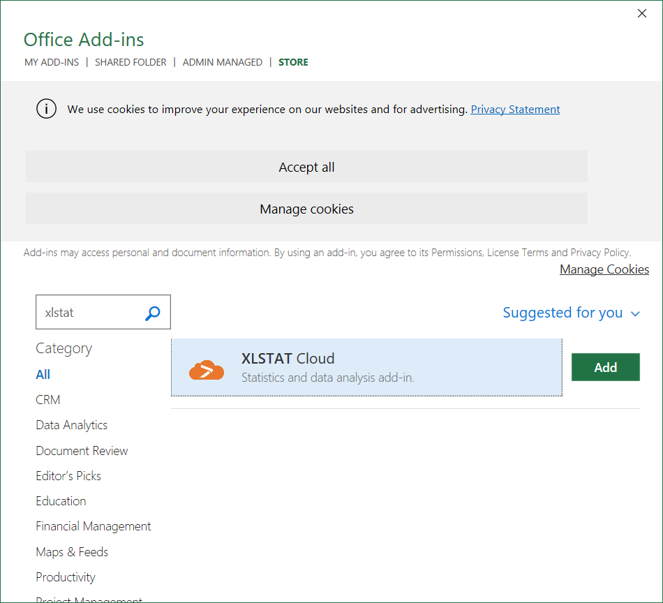 Enter "XLSTAT Cloud" in the search field to find XLSTAT Cloud in the office store.
