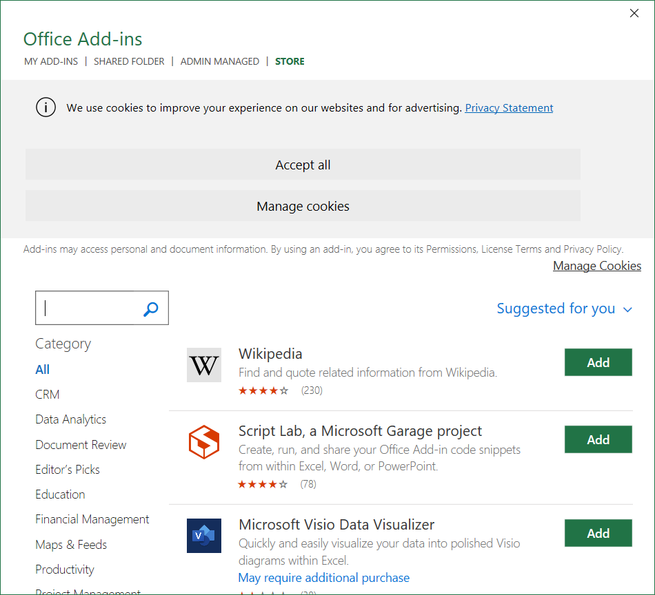 Once Excel is launched, click Insert > Office Add-In. This action opens the office store so that you can install add-ons.