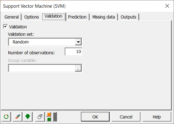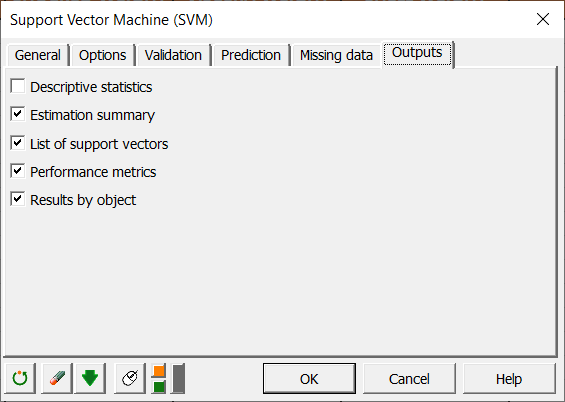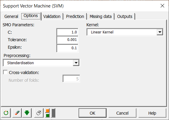 We select Standardisation in the preprocessing field and we use linear kernels as shown below. As we want to see how well our regression model performs, we will make a validation sample out of the training sample. For this purpose, in the Validation tab, we check the Validation checkbox and select 10 observations randomly drawn from the training sample as indicated below. Finally, in the Outputs tab, we select the outputs we want to obtain as shown below: ## Interpreting the results of the SVM regressor