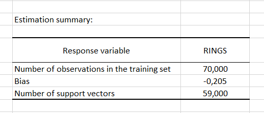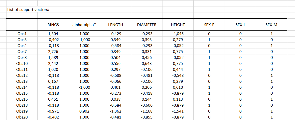 The coefficient of determination for the validation set has a correct score of 71%. The second table displays a summary of the optimized SVR. You can see on the figure below that there were 70 observations used to train the regressor out of which 59 support vectors have been identified. Finally, the bias, which is the origin of the hyperplane, will be used during the prediction of the validation sample. The next table shown below gives the complete list of the 59 supports vectors with the associated alpha-alpha* coefficient values, values of the response variable, scaled explanatory variables and the disjunctive matrix of qualitative variables. Finally, you can see predicted values obtained by the regression for each observation on the figure below: