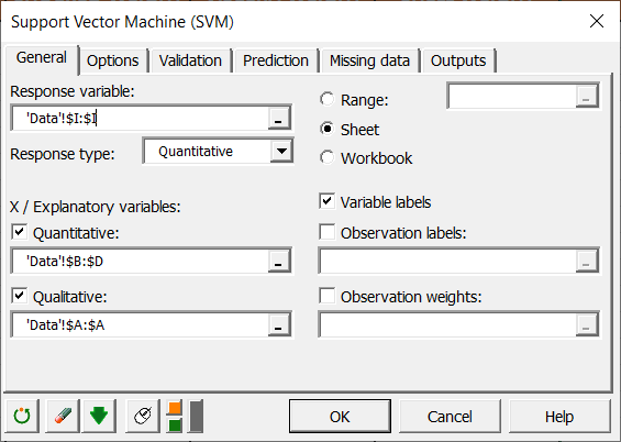 Once you have clicked on the button, the SVM dialog box appears. Select the data on the Excel sheet.