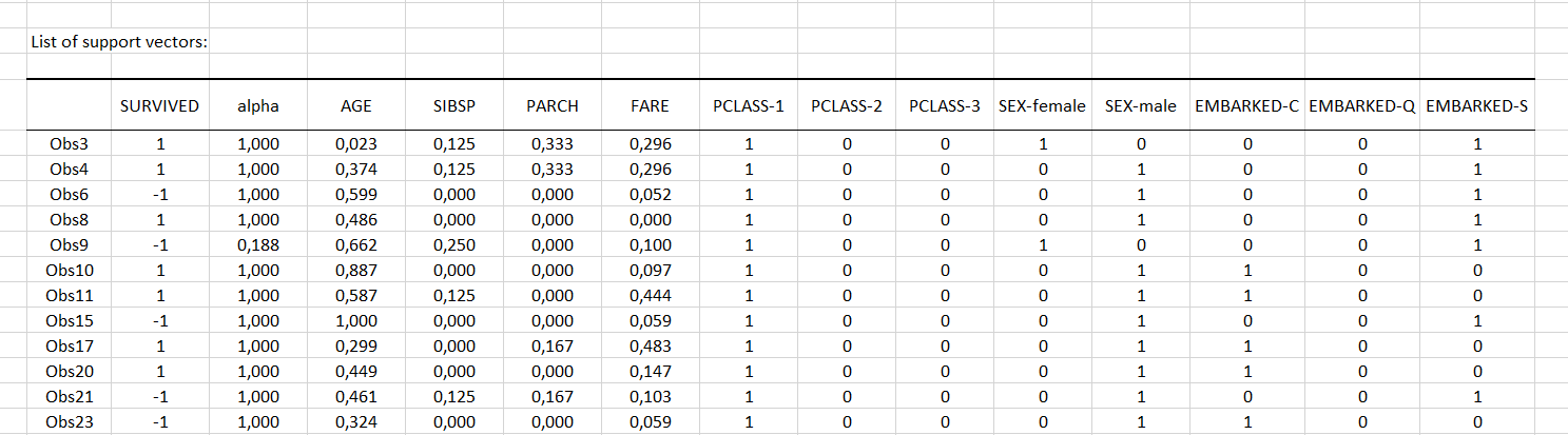La segunda tabla que se muestra a continuación presenta la lista completa de los 456 vectores de soporte junto con los valores de los coeficientes alfa asociados y el valor positivo o negativo de la clase de salida. Junto con el valor de sesgo de la tabla anterior, esta información es suficiente para describir completamente el clasificador optimizado.