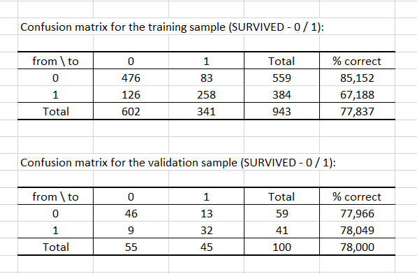 Las dos tablas siguientes muestran las matrices de confusión resultantes a partir tanto del entrenamiento como de las muestras de validación. Esas matrices nos dan indicios de lo bien que se ha comportado nuestro clasificador. Para la base de datos de entrenamiento, tenemos un 77.84% de respuestas correctas, y esta cifra se eleva hasta el 78% para la base de validación.