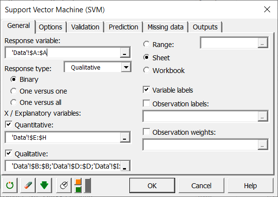 Una vez haya hecho clic en el botón, aparece el cuadro de diálogo SVM. Seleccione los datos en la hoja de cálculo de Excel.