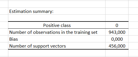 La primera tabla muestra un resumen del clasificador SVM optimizado. Se puede ver en la siguiente figura que el clasificador tenía que clasificar entre las clases 0 y 1, y que la clase 0 ha sido etiquetada como la clase positiva. Se usaron 943 observaciones para entrenar al clasificador, de los cuales han sido identificados 456 vectores de soporte.