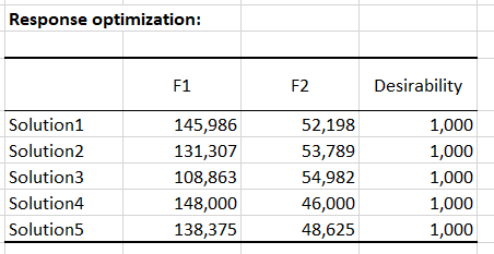 Then select the option to maximize the response in the optimization table, which will find the optimum values of debinding temperature (F1) and debinding time (F2) of the industrial process to obtain a percentage of maximum extract binder.