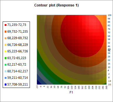 Then the response surface is displayed. This is possible thanks to contour graphs in 2 and 3 dimensions (2D and 3D). We can clearly see that the optimal surface is in red in these graphics.