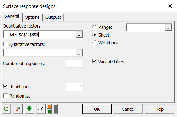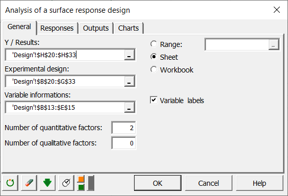 In the General tab, select the table of quantitative factors (this table must contain a maximum of two rows, the minimum and the maximum for each of the factors), as well as the number of responses (1).