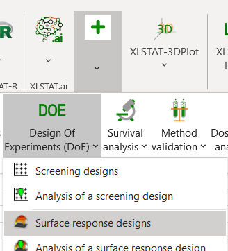 After launching XLSTAT, click on the DOE button on the XLSTAT bar and select response surface design.