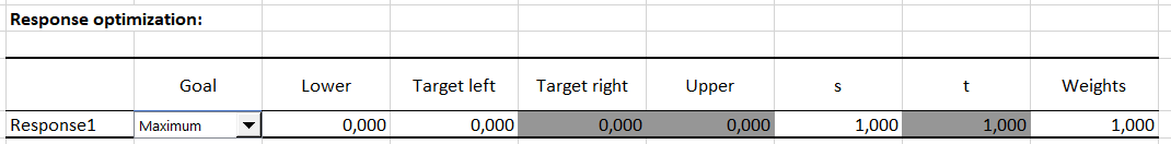 Then the design is displayed, in which you need to fill the last column, corresponding to the response, with the results of the experiments. Below, the response optimization table is displayed, it will automatically fill in after entering the response results.
