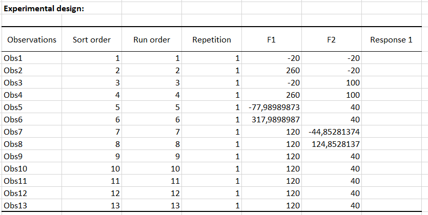 Once the design has been generated, we therefore carry out the 13 experiments and enter the results in the appropriate column in the table of the design.