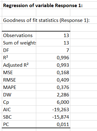 Then all the results of the analysis of variance are displayed, starting with the goodness of fits coefficients. We can see that the R² = 0.996, which shows that the regression describes the data very well.