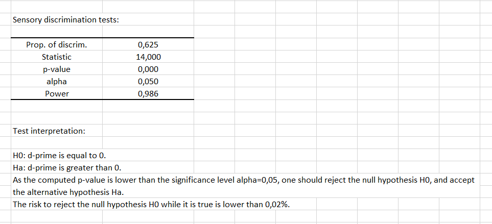 Then the test results and interpretation are given. Here, the p-value is lower than 0.05, so we can reject the null hypothesis that d' is equal to zero. Therefore, we suggest that each beer does not follow the same normal distribution. We can thus reject the hypothesis that beers are similar. Furthermore, the power of our test being very high we can conclude that our test is robust enough.