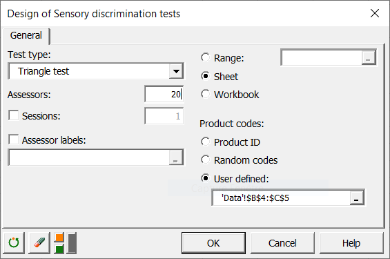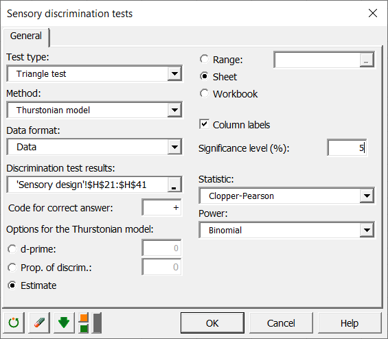 The dialog box appears. Select the triangle test in the Test type field and the Thurstonian model in the Method field. We select the yellow column of the design table in the Discrimination test results field and enter + as a code for the correct answer.