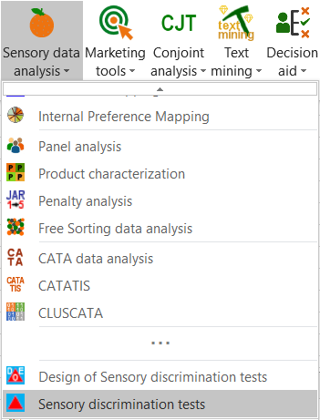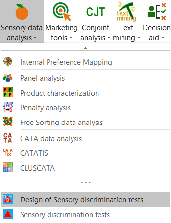 Once XLSTAT is activated, select the XLSTAT-Sensory data analysis / Design for sensory discrimination test feature.