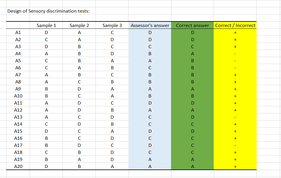 The output table allows (see below) you to run the test for 20 assessors. Each judge tastes 3 samples in the designated order. He will have to recognize the beer present only once. The fourth column allows you to enter the judge's answer. The fifth one gives the correct answer. The last column allows you to enter the test result. Just enter one code for a correct answer (+ in our case) and another code for an incorrect answer (- in our case). Of course, other codes can also be used. Note: If you enter the results in the fourth column, the last column will be filled automatically.