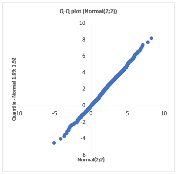 The first result displayed is the Q-Q plot for the first sample. The Q-Q plot allows to compare the cumulative distribution function (cdf) of the sample (abscissa) to the cumulative distribution function of a theoretical normal distribution with the same mean and standard deviation (ordinates). In the case of samples following a normal distribution, we should observe an alignment with the first bisecting line. In the other cases some deviations from the bisecting line should be observed.