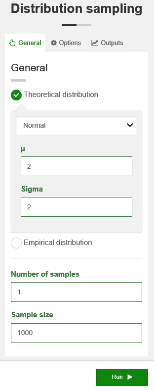 The dialog box displayed below corresponds to the generation of a sample of 1000 cases from a normal N(2,2) distribution.