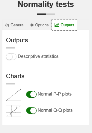 In the Outputs tab, activate the Q-Q plots and P-P plots to visually assess sample normality.