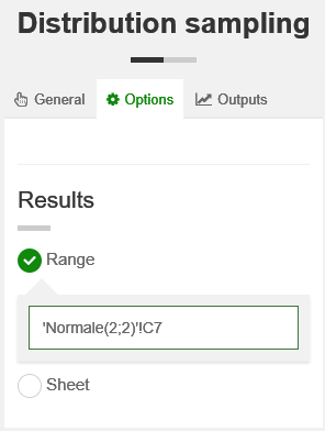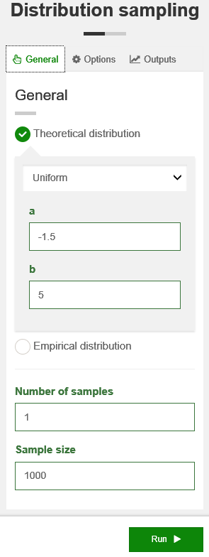 We want to generate two samples, the first one sampled in a Normal N(2,2) distribution (mean = 2, standard deviation (sigma) = 2), the second one in a Uniform distribution, bounded between -1.5 and 5. To do that, we use the Distribution sampling tool available in the Preparing data section.