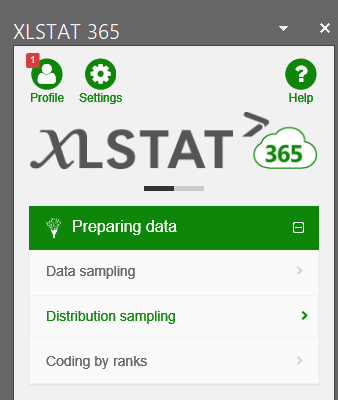 After opening XLSTAT 365, click on Distribution sampling in the Preparing data menu: