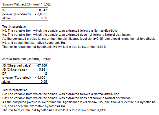 As a conclusion, in this tutorial we have seen how to generate two samples, one following a Normal distribution, the second following a Uniform distribution. We then applied the Jarque-Bera and the Shapiro-Wilk tests on them. These tests did not reject the normality assumption for the first sample, and allowed us to reject it for the second sample.