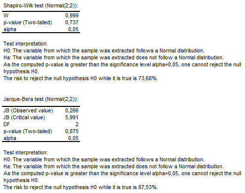 The Shapiro-Wilk and Jarque-Bera tests confirm that we cannot reject the normality assumption for the sample, (p > alpha). We notice that with the Shapiro-Wilk test, the risk of being wrong when rejecting the null assumption is smaller than with the Jarque-Bera test.