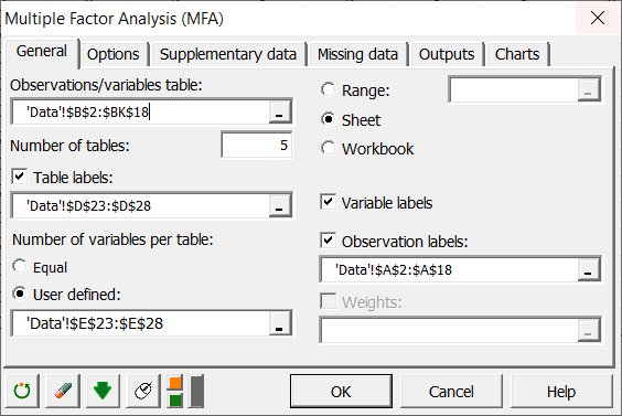 Once XLSTAT is open, select the Advanced Features / Multiblock data analysis / Multiple Factor Analysis (MFA) command in the XLSTAT menu. Note that MFA is also available under the Sensory data analysis menu. Once you have clicked on the button, the MFA dialog box appears. Select the data in the demo file that correspond to all the variables of interest. As we saw above, the variables can be grouped into 5 different tables. We need to specify that the number of tables is 5. We then select the names we have given to the 5 tables (Oligochaeta, Coleoptera, Trichoptera, Mollusca et Diptera). Finally, we define the number of variables within each table. As the number is not the same for all the tables, we select a range on the Excel sheet that contains the number of variables within each table. As the column headers are available in all the selections, we activate the option Variable labels. In the Options tab, select the frequency data type as we are using frequency tables corresponding to count data of species. After you have clicked on the OK button, the computations start and the results are displayed on a new Excel sheet.