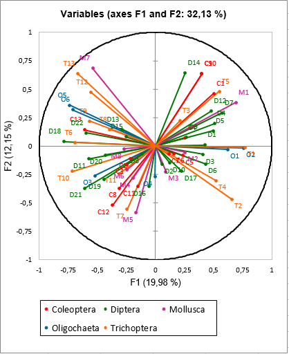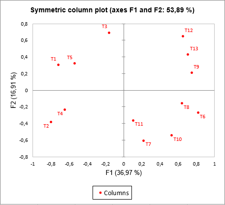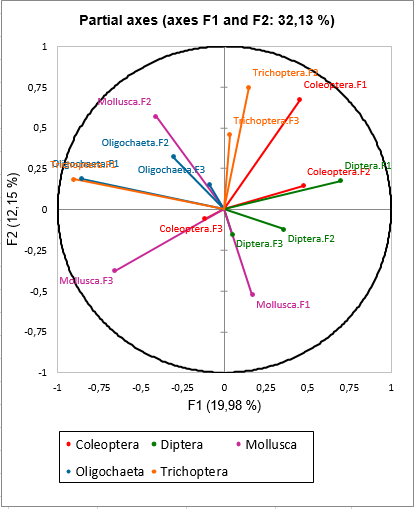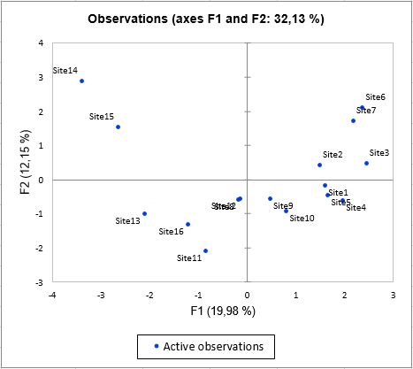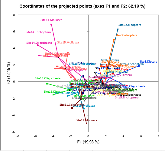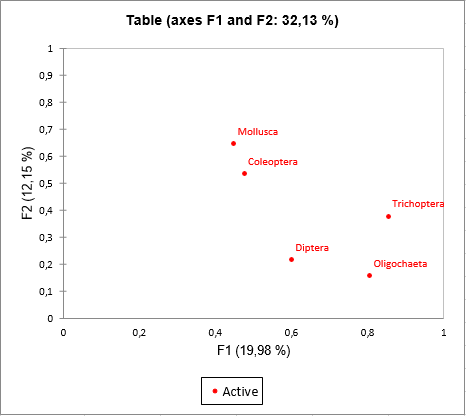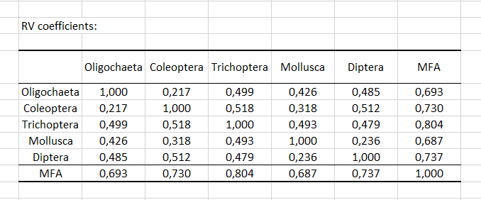 The first set of results corresponds to the descriptive statistics of the various variables followed by separate analyses are run on each table. Because every table is a frequency table, a Correspondence Analysis (CA) is performed on each of them. The results of these preliminary analyses are then used in the final analysis, the second phase of the Multiple Factor Analysis, which is, in fact, a weighted PCA (the weights are set on the columns). The results of the MFA start with the analysis of the eigenvalues of the weighted PCA. The first results concern variables (colored according to their group) and the observations as in a classic PCA. The results specific to MFA are then displayed. First of all, the table coordinates are displayed and used to create the graph of tables. We can see on the graph that the first axis is strongly linked to tables Trichoptera and Oligochaerta while the axis 2 is linked to tables Mollusca and Coleopteras. The Lg coefficients of the relationship between the tables allow to measure to what extent the tables are related two by two. The RV coefficients (see below) of the relationship between the tables are another measure derived from the Lg coefficients. The value of the RV coefficients varies between 0 and 1, which make them easier to analyze. We can see here that the two closest tables are the taste and the olfaction after shaking. More surprisingly, we see that the RV coefficient between Diptera and Coleoptera is the highest. The specific following result in MFA corresponds to the analysis of the partial axes. The graph of the partial axes allows to see which axes (factors) of every separate analysis are correlated to axes produced by MFA. We see for example that the axis 1 of CA of the table Oligochaeta and the axis 1 of CA of the table Trichoptera are strongly negatively correlated to the axis 1 of MFA. If we look more precisely at the separate results in particular at the variable coordinates of the CA of the table Trichoptera (row 517 of the results sheet), we notice that negative values on the first axis of this CA correspond to important frequencies of the species T1, T2, T3, T4 and T5. The last chart specific to MFA is based on the observations chart with the projected points being added to the observations, and lines being drawn between the observation and the corresponding projected points. The projected points correspond to supplementary observations for which only the information provided by one table is taken into account, the other tables being transformed to 0s. This allows to see how the different tables influence the position of a given point. For example, for the site 14, we see that the table Mollusca tend to make this site even more different from the others, this is also for the site 11 and the table Mollusca at the bottom of the chart. As a conclusion, Multiple Factor Analysis is an interesting and rich method because it makes it possible to analyze complex data sets, and provides many graphical results: we can visualize tables (in which variables are grouped), the variables themselves, and the observations. In this particular example, it allowed us to quickly position the sites on a map while being able to quickly interpret their position.