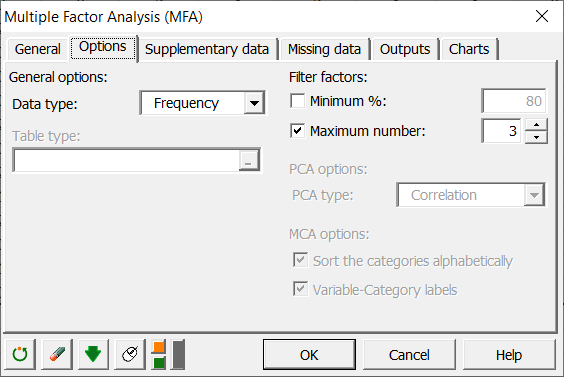 Multiple Factor Analysis (MFA) is useful to simultaneously analyze several tables of variables and to obtain results, particularly charts, that allow to study the relationship between the observations, the variables and the tables.We focus here on the particular case of the MFA for frequency tables. For a more general description of the MFA and are used on other types of tables, you can refer to this tutorial.
