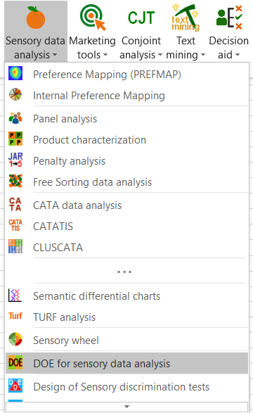 Tras abrir XLSTAT, haga clic en el botón Análisis de datos sensoriales de la cinta y seleccione DOE para análisis sensoriales (ver más abajo).