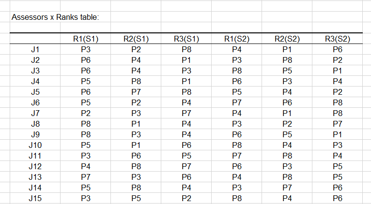 La segunda tabla contiene el diseño tal como ha sido generado. Cada fila corresponde a un juez y cada columna a un experimento. Hay 60 filas y 3*2 columnas. Puede encontrar un extracto de esta tabla más abajo.