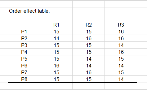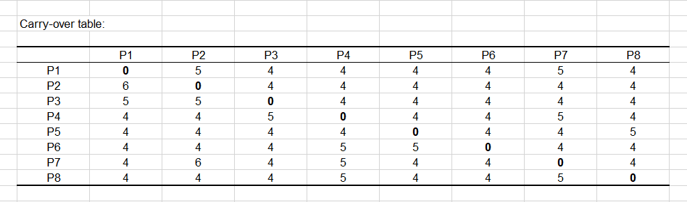 La tabla de arrastre (“carry-over table”) muestra cuántas veces ha sido calificado cada producto justo después de otro. Debería ser lo más cercano posible a una tabla constante.