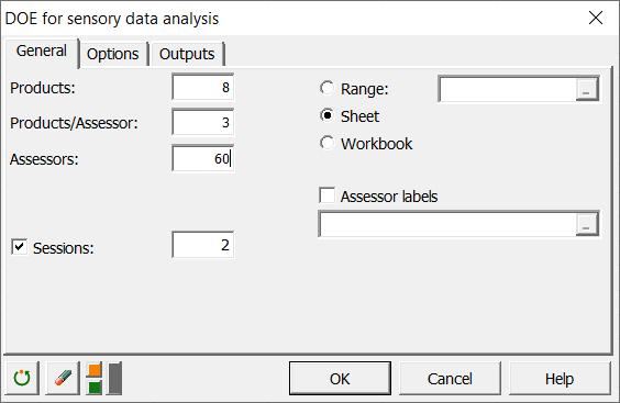 Una vez ha hecho clic en el botón, aparece el cuadro de diálogo. Escriba el número de productos, el número de productos probados por cada juez, el número de jueces y el número de sesiones.