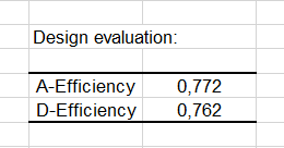 Se muestran en primer lugar los resultados de todas las sesiones tomadas en conjunto, seguidos de los resultados de cada sesión. El primer resultado que XLSTAT muestra es una tabla con los criterios de A-Eficiencia y D-Eficiencia.