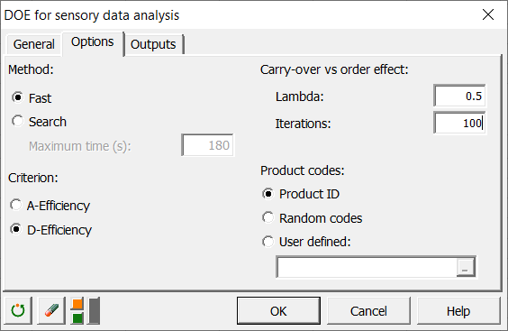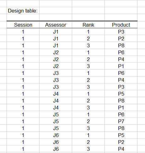 La tabla del diseño puede usarse más tarde para ejecutar un ANOVA, una vez que las calificaciones otorgadas por los jueces han sido registradas. Incluye cuatro columnas (sesión, juez, rango y producto) y tiene 2*60*3 = 360 filas. Una vez la tabla ha sido completada con las calificaciones, puede usar la función ANOVA de XLSTAT o la herramienta “Caracterización de productsos” includa en la herramienta de análisis de datos XLSTAT-Sensory para comparar los productos.