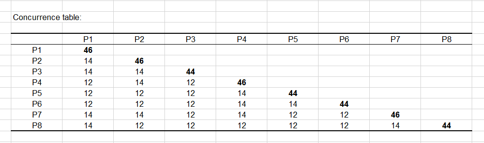 Las tablas siguientes se muestran en orden para entender mejor la precedente. Conciernen a ambas sesiones. La tabla de concurrencia muestra cuántas veces dos productos han sido calificados por el mismo juez.