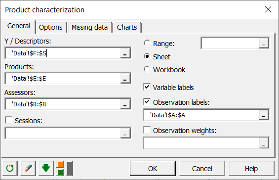 Debe en primer lugar seleccionar los descriptores (o características), y a continuación la columna productos y la columna jueces. Puesto que hemos seleccionado el título de las columnas, dejamos activada la opción Etiquetas de las variables.