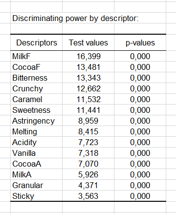A continuación, la segunda tabla contiene las características ordenadas desde la que tiene el poder de discriminación más alto que el que tiene el poder de discriminación más bajo en las bebidas de chocolate. Podemos ver que el sabor de la leche tiene un alto poder de discriminación. También se muestran los valores de las pruebas asociadas y los valores de p.