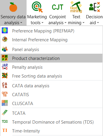 Tras abrir XLSTAT, haga clic en el botón Análisis de datos sensoriales y seleccione Caracterización de productos (ver más abajo).